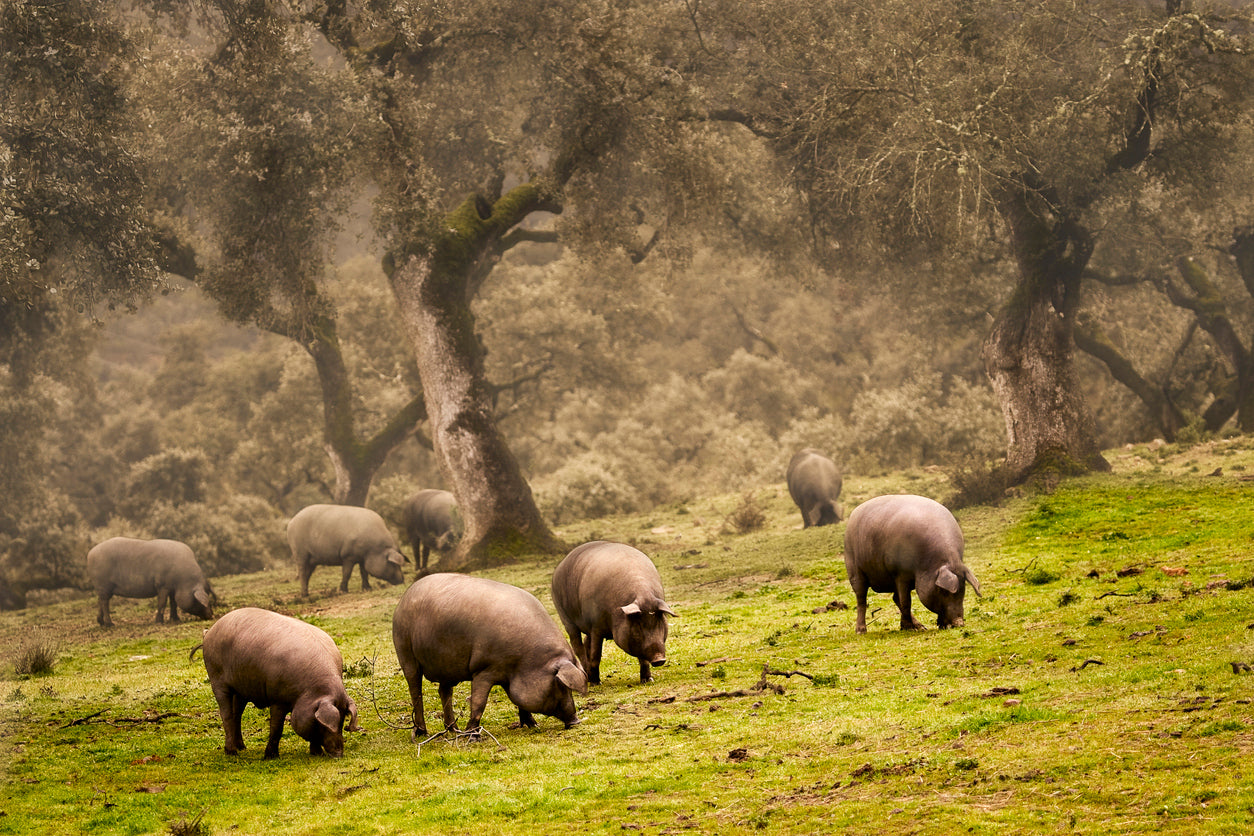 Our pigs enjoy a wholesome and free–range life in the lush woodlands of our farms. They freely forage, root, and indulge on a natural diet of European acorns, giving their meat a distinctive flavor.
