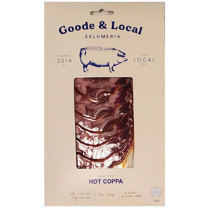 Discover our exquisite Hot Coppa, crafted from the marbled tenderness of boneless pork collar and carefully hand-rubbed with the heat of Calabrian peppers, then patiently dry-cured for months. Spice up your charcuterie board with our Italian-style Mangalitsa Hot Coppa, boasting a bold flavor and sliced thin to perfection. Resembling the velvety texture of prosciutto, each thin slice captures the essence of its earthy richness and remarkable tenderness. Perfect for sandwiches and an essential addition to your charcuterie board, this three 1oz serving promises a culinary experience like no other.